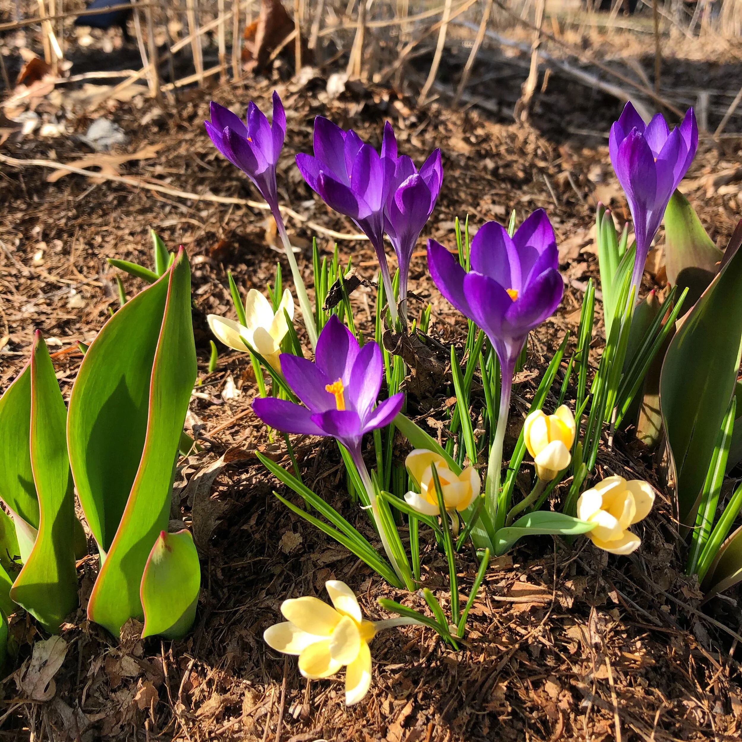 Our first blooms of spring! Crocus coming up through the mulch.